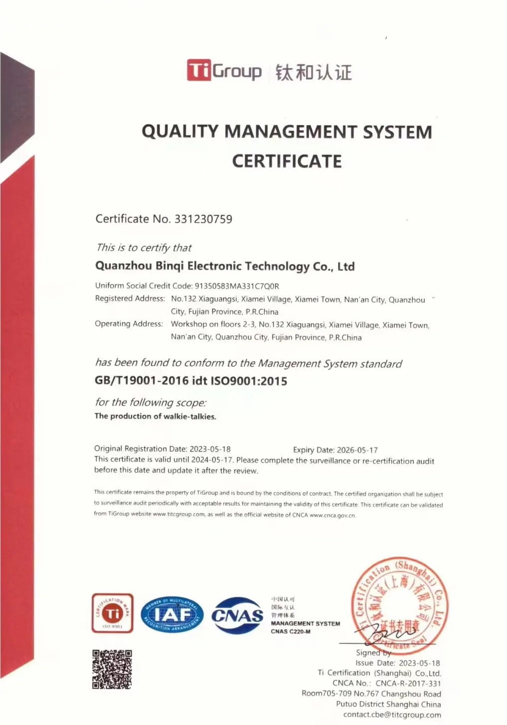 Quanzhou BinQi Electronic Technology Co.,Ltd is a factory that specializes in the manufacturing, development and sales of walkie-talkies.